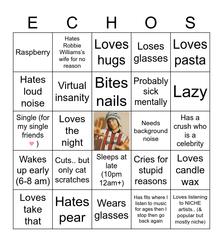 This bingo card has a free space and 24 words: Loves take that, Cuts.. but only cat scratches, Bites nails, Has fits where I listen to music for ages then I stop then go back again, Loves pasta, Raspberry, Hates Robbie Williams’s wife for no reason, Loves hugs, Needs background noise, Has a crush who is a celebrity, Single (for my single friends 🩷), Virtual insanity, Cries for stupid reasons, Loves candle wax, Hates loud noise, Hates pear, Wears glasses, Loses glasses, Lazy, Wakes up early (6-8 am), Loves the night, Sleeps at late (10pm 12am+), Probably sick mentally and Loves listening to NICHE artists.. (& popular but mostly niche).
