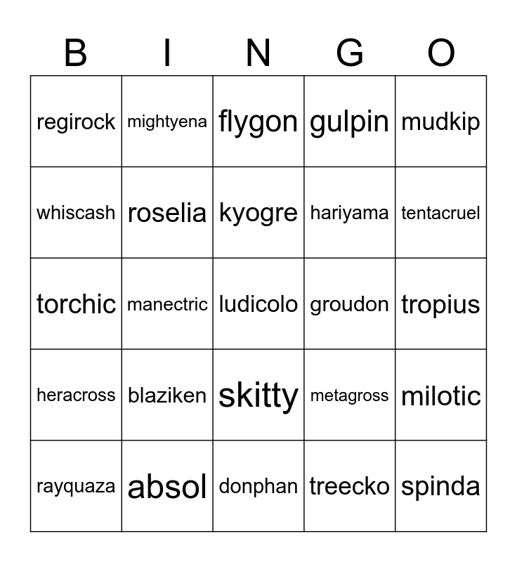 This bingo card has a free space and 24 words: blaziken, absol, kyogre, rayquaza, mudkip, regirock, whiscash, mightyena, groudon, skitty, hariyama, torchic, metagross, milotic, roselia, treecko, tropius, flygon, tentacruel, manectric, spinda, heracross, gulpin and donphan.