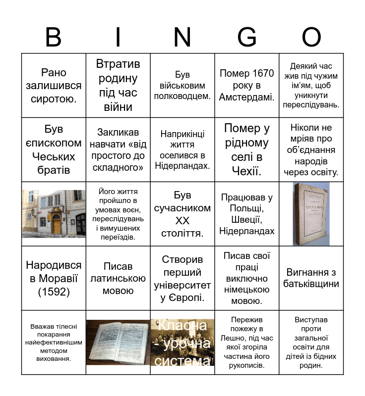 This bingo card has 4 images and 22 words: Народився в Моравії (1592), Був сучасником ХХ століття., Пережив пожежу в Лешно, під час якої згоріла частина його рукописів., Деякий час жив під чужим ім’ям, щоб уникнути переслідувань., Рано залишився сиротою., Втратив родину під час війни, Був військовим полководцем., Працював у Польщі, Швеції, Нідерландах, Вигнання з батьківщини, Був єпископом Чеських братів, Закликав навчати «від простого до складного», Класна - урочна система, Писав свої праці виключно німецькою мовою., Ніколи не мріяв про об’єднання народів через освіту., Вважав тілесні покарання найефективнішим методом виховання., Його життя пройшло в умовах воєн, переслідувань і вимушених переїздів., Наприкінці життя оселився в Нідерландах., Помер у рідному селі в Чехії., Писав латинською мовою, Створив перший університет у Європі., Помер 1670 року в Амстердамі. and Виступав проти загальної освіти для дітей із бідних родин..