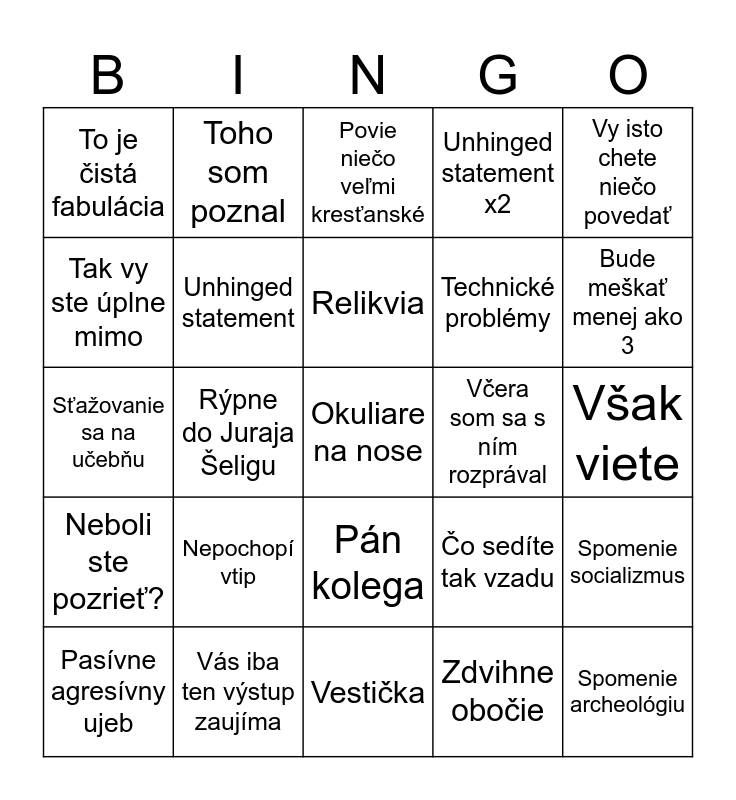 This bingo card has a free space and 24 words: Nepochopí vtip, Vás iba ten výstup zaujíma, Relikvia, Pasívne agresívny ujeb, Vy isto chete niečo povedať, To je čistá fabulácia, Tak vy ste úplne mimo, Toho som poznal, Včera som sa s ním rozprával, Pán kolega, Technické problémy, Sťažovanie sa na učebňu, Čo sedíte tak vzadu, Spomenie socializmus, Unhinged statement, Zdvihne obočie, Však viete, Povie niečo veľmi kresťanské, Bude meškať menej ako 3, Rýpne do Juraja Šeligu, Spomenie archeológiu, Neboli ste pozrieť?, Unhinged statement x2 and Vestička.