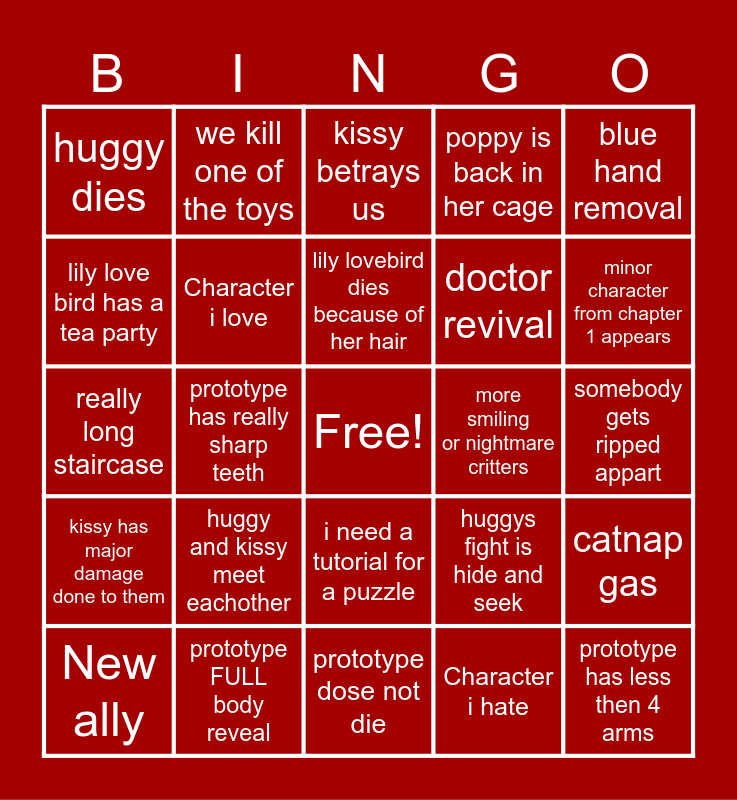 This bingo card has a free space and 24 words: huggy and kissy meet eachother, prototype FULL body reveal, lily lovebird dies because of her hair, New ally, blue hand removal, huggy dies, lily love bird has a tea party, we kill one of the toys, more smiling or nightmare critters, i need a tutorial for a puzzle, doctor revival, really long staircase, huggys fight is hide and seek, catnap gas, Character i love, Character i hate, somebody gets ripped appart, kissy betrays us, minor character from chapter 1 appears, prototype has really sharp teeth, prototype has less then 4 arms, kissy has major damage done to them, poppy is back in her cage and prototype dose not die.