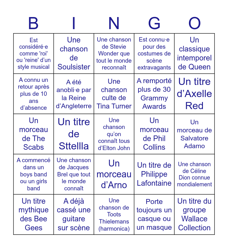 This bingo card has 61 words: Free!, A déjà cassé une guitare sur scène, A joué à la mi temps du Super Bowl, A commencé dans un boys band ou un girls band, Porte toujours un casque ou un masque, Est entré·e sur scène suspendu·e dans les airs, A été anobli·e par la Reine d’Angleterre, Possède l’album le plus vendu de l’histoire, A remporté plus de 30 Grammy Awards, A déjà composé pour un film Disney, Est connu·e pour des costumes de scène extravagants, A joué dans son propre film ou biopic, A connu un retour après plus de 10 ans d’absence, A une coupe de cheveux iconique, Joue de plusieurs instruments sur scène, Est considéré·e comme 'roi' ou 'reine' d’un style musical, Une chanson qu’on connaît tous d’Elton John, Un classique intemporel de Queen, Un tube d’ABBA qui passe encore en soirée, Une chanson culte de Tina Turner, Un morceau de Phil Collins, Une chanson de Stevie Wonder que tout le monde reconnaît, Un titre mythique des Bee Gees, Une chanson de Céline Dion connue mondialement, Un morceau de Billy Joel, Une chanson de Rod Stewart, Un classique de Jacques Brel, Une chanson de Salvatore Adamo, Un titre d’Axelle Red, Une chanson d’Arno que tout le monde reconnaît, Un morceau de Maurane, Une chanson de Philippe Lafontaine, Une chanson de Hooverphonic de la période 90–2000, Un titre de Vaya Con Dios, Une chanson de Soulsister, Un morceau de Kim’Kay (nostalgie 90s), Une chanson de Axelle Red appréciée par toutes les générations, Un titre de Sttellla, Une chanson de Ghinzu, Un morceau de The Scabs, Une chanson d’Urban Trad (Eurovision), Une chanson de Jacques Brel que tout le monde connaît, Un morceau de Salvatore Adamo, Une chanson de Maurane, Un titre de Philippe Lafontaine, Un classique de Julos Beaucarne, Une chanson de Pierre Rapsat, Un titre de Marc Aryan, Une chanson d’Annie Cordy, Un morceau d’Arno, Une chanson de Toots Thielemans (harmonica), Un titre du groupe Machiavel, Une chanson de Yves Duteil… euh non ! (clin d’œil belge : on confond souvent), Un morceau de Johan Verminnen, Une chanson du Grand Jojo, Un classique de Will Tura, Une chanson de Raymond van het Groenewoud, Un morceau de Lara Fabian de ses débuts, Une chanson de Jo Lemaire, Un titre du groupe Wallace Collection and Un titre de l’artiste belge qui se demande Papaoutai ? (Stromae).