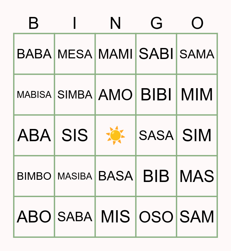 This bingo card has a free space and 30 words: ABO, MAIS, AMO, ASO, SAMA, BABA, MESA, BASA, SASA, SAM, BIMBO, SIMBA, ISA, OSO, MAS, ASIM, SIS, MIS, BIB, MIM, ABA, SABA, MAMI, BIBI, SIM, MABISA, MASIBA, BASO, SABI and SISA.
