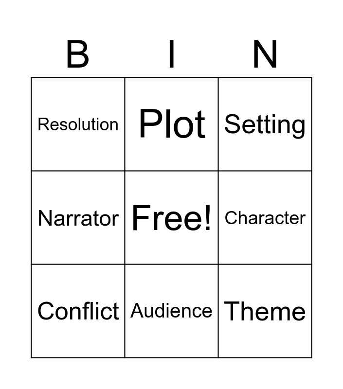 This bingo card has a free space and 8 words: Character, Setting, Plot, Conflict, Resolution, Theme, Narrator and Audience.