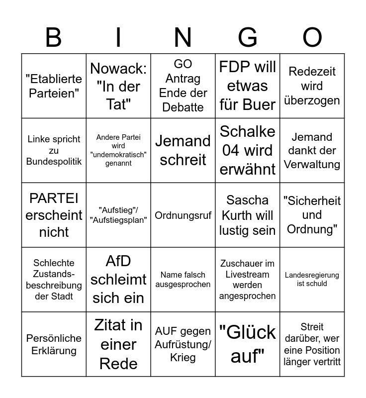 This bingo card has a free space and 24 words: AfD schleimt sich ein, Zitat in einer Rede, Jemand schreit, Persönliche Erklärung, Redezeit wird überzogen, "Etablierte Parteien", Linke spricht zu Bundespolitik, Nowack: "In der Tat", Sascha Kurth will lustig sein, Name falsch ausgesprochen, Schalke 04 wird erwähnt, PARTEI erscheint nicht, Zuschauer im Livestream werden angesprochen, Landesregierung ist schuld, Andere Partei wird "undemokratisch" genannt, "Glück auf", "Sicherheit und Ordnung", GO Antrag Ende der Debatte, Jemand dankt der Verwaltung, "Aufstieg"/ "Aufstiegsplan", Streit darüber, wer eine Position länger vertritt, Schlechte Zustands-beschreibung der Stadt, FDP will etwas für Buer and AUF gegen Aufrüstung/ Krieg.
