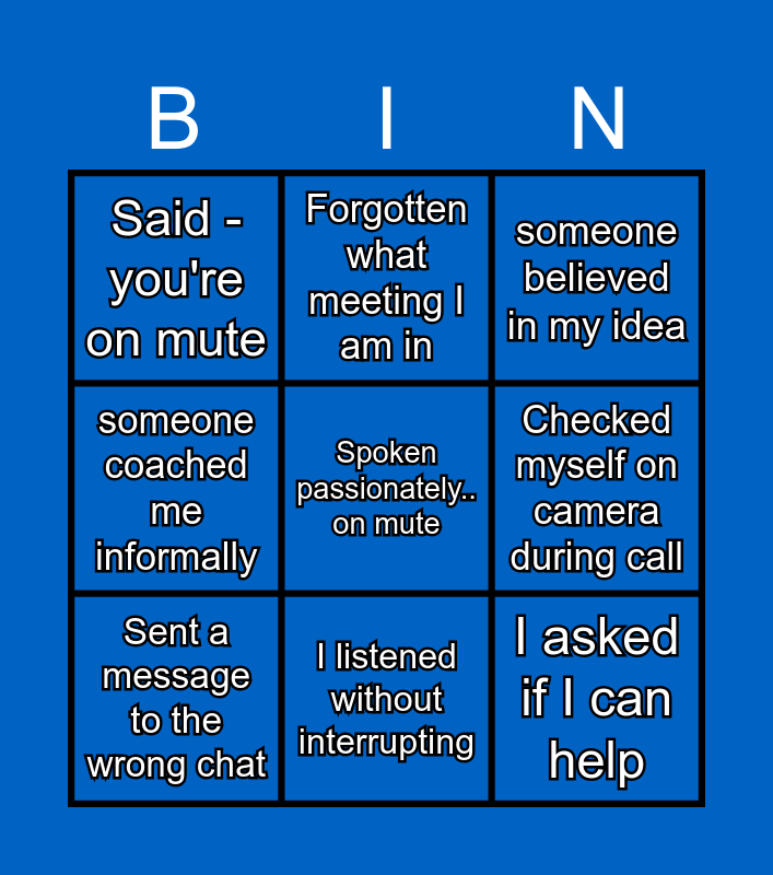 This bingo card has 24 words: I felt proud of my team, Someone checked on me personally, I learned from someone younger, I smiled At someone, I listened without interrupting, someone believed in my idea, Said - you're on mute, Forgotten what meeting I am in, Double booked for meetings, Blocked focus time still took calls, Multitasked, Someone made me laugh during a hard day, someone reminded to take a break, Took time off guilt free, I asked if I can help, Gave honest but kind feedback, Presented slides and realized wasn't sharing screen, Checked myself on camera during call, someone coached me informally, A colleague covered for me, Received unexpected encouragement, Sent a message to the wrong chat, Spoken passionately.. on mute and thanked someone publicly.