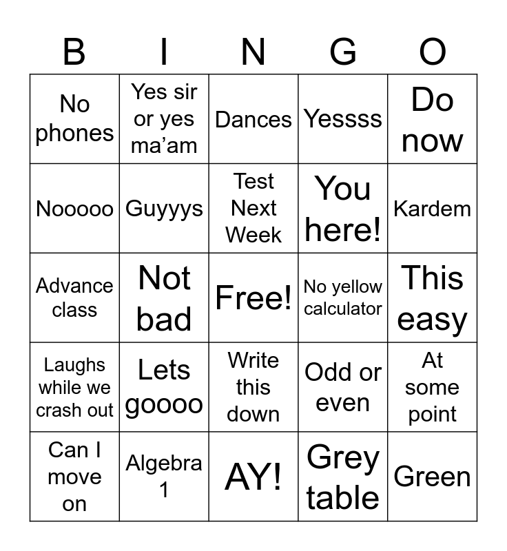 This bingo card has a free space and 24 words: Lets goooo, Algebra 1, Test Next Week, Can I move on, Do now, No phones, Nooooo, Yes sir or yes ma’am, No yellow calculator, Write this down, You here!, Advance class, Odd or even, At some point, Guyyys, Grey table, This easy, Dances, Kardem, Not bad, Green, Laughs while we crash out, Yessss and AY!.