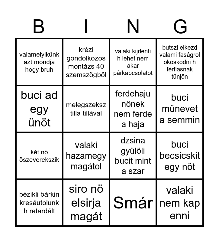 This bingo card has 16 words: siro nö elsirja magát, buci becsicskit egy nöt, valaki kijrlenti h lehet nem akar párkapcsolatot, valamelyikünk azt mondja hogy bruh, két nö öszeverekszik, krézi gondolkozos montázs 40 szemszögböl, dzsina gyülöli bucit mint a szar, Smár, buci ad egy ünöt, melegszeksz tilla tillával, bézikli bárkin kresáutolunk h retardált, butszi elkezd valami faságrol okoskodni h férfiasnak tünjön, valaki hazamegy magátol, buci münevet a semmin, ferdehaju nönek nem ferde a haja and valaki nem kap enni.