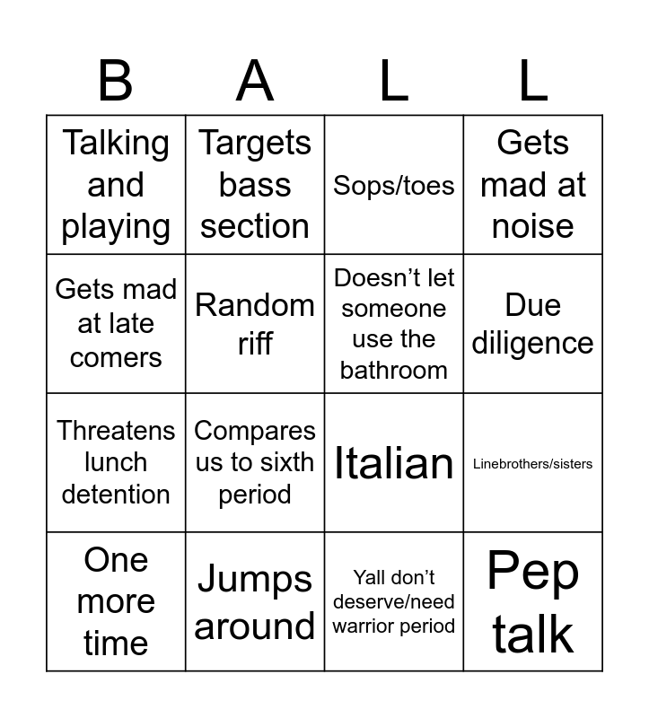 This bingo card has 16 words: Jumps around, Linebrothers/sisters, Sops/toes, Talking and playing, Threatens lunch detention, Targets bass section, Italian, Yall don’t deserve/need warrior period, Gets mad at late comers, Random riff, One more time, Gets mad at noise, Compares us to sixth period, Due diligence, Doesn’t let someone use the bathroom and Pep talk.