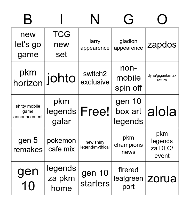 This bingo card has a free space and 24 words: gen 10, pokemon cafe mix, switch2 exclusive, firered leafgreen port, zapdos, new let's go game, TCG new set, larry appearence, gen 10 box art legends, alola, shitty mobile game announcement, johto, pkm champions news, pkm legends za DLC/ event, pkm horizon, legends za pkm home, gen 10 starters, gladion appearence, dyna/gigantamax return, gen 5 remakes, pkm legends galar, new shiny legend/mythical, non-mobile spin off and zorua.