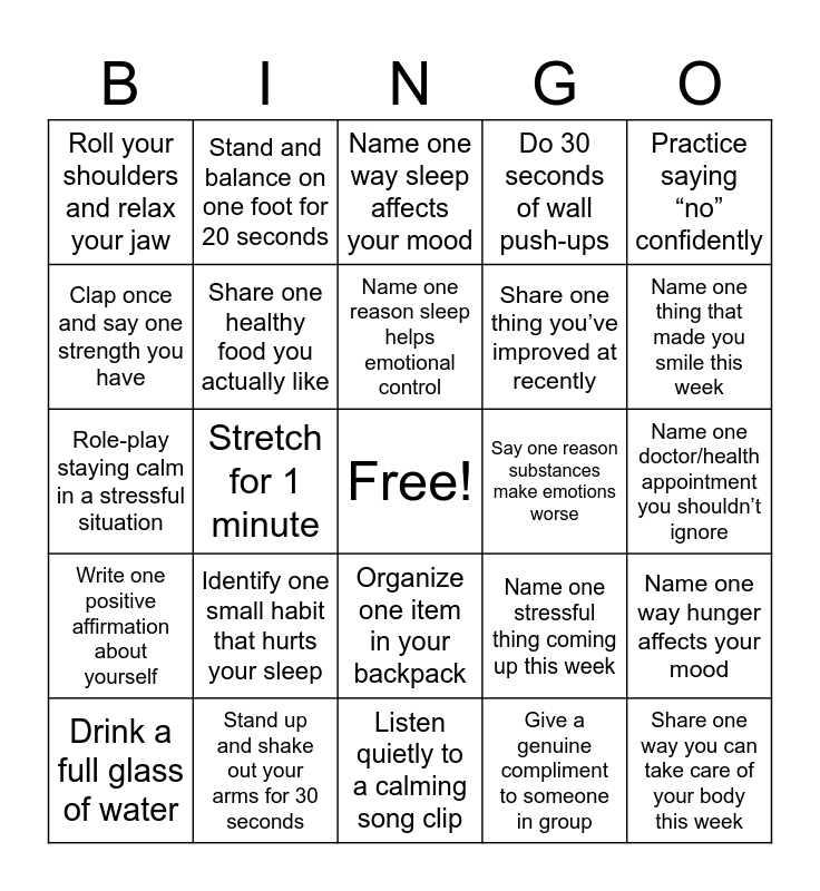 This bingo card has a free space and 29 words: Drink a full glass of water, Do 10 jumping jacks, Stretch for 1 minute, Take 5 slow deep breaths, Roll your shoulders and relax your jaw, Name one way sleep affects your mood, Share one healthy food you actually like, Identify one small habit that hurts your sleep, Say one reason substances make emotions worse, Stand up and shake out your arms for 30 seconds, Name one doctor/health appointment you shouldn’t ignore, Share one way you can take care of your body this week, Listen quietly to a calming song clip, Give a genuine compliment to someone in group, Name one thing that made you smile this week, Share one small goal for tomorrow, Organize one item in your backpack, Write one positive affirmation about yourself, Practice saying “no” confidently, Role-play staying calm in a stressful situation, Name one stressful thing coming up this week, Say one way you could cope ahead for it, Share one thing you’ve improved at recently, Clap once and say one strength you have, Do 30 seconds of wall push-ups, Stand and balance on one foot for 20 seconds, Name one way hunger affects your mood, Name one reason sleep helps emotional control and Practice a 4-count inhale and 4-count exhale.