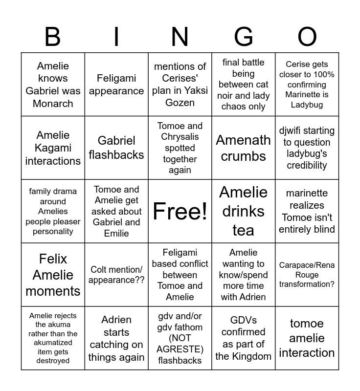 This bingo card has a free space and 24 words: Colt mention/ appearance??, Adrien starts catching on things again, Tomoe and Chrysalis spotted together again, Amelie rejects the akuma rather than the akumatized item gets destroyed, Cerise gets closer to 100% confirming Marinette is Ladybug, Amelie knows Gabriel was Monarch, Amelie Kagami interactions, Feligami appearance, Amelie drinks tea, Feligami based conflict between Tomoe and Amelie, Amenath crumbs, family drama around Amelies people pleaser personality, Amelie wanting to know/spend more time with Adrien, Carapace/Rena Rouge transformation?, Gabriel flashbacks, GDVs confirmed as part of the Kingdom, marinette realizes Tomoe isn't entirely blind, mentions of Cerises' plan in Yaksi Gozen, djwifi starting to question ladybug's credibility, Tomoe and Amelie get asked about Gabriel and Emilie, tomoe amelie interaction, Felix Amelie moments, final battle being between cat noir and lady chaos only and gdv and/or gdv fathom (NOT AGRESTE) flashbacks.