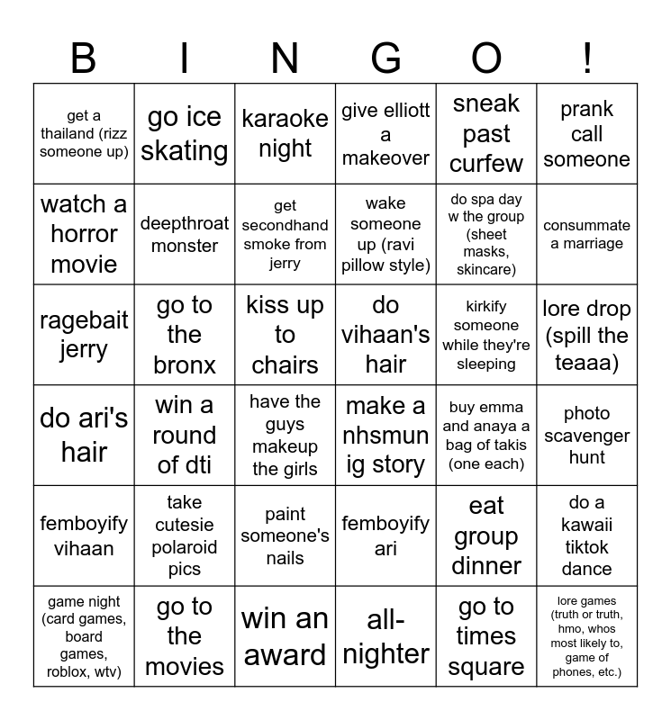 This bingo card has 36 words: femboyify ari, paint someone's nails, all-nighter, watch a horror movie, do ari's hair, do vihaan's hair, deepthroat monster, win an award, sneak past curfew, eat group dinner, consummate a marriage, give elliott a makeover, do a kawaii tiktok dance, go to the bronx, wake someone up (ravi pillow style), get a thailand (rizz someone up), femboyify vihaan, kirkify someone while they're sleeping, ragebait jerry, karaoke night, kiss up to chairs, win a round of dti, make a nhsmun ig story, have the guys makeup the girls, buy emma and anaya a bag of takis (one each), go ice skating, do spa day w the group (sheet masks, skincare), go to the movies, get secondhand smoke from jerry, prank call someone, lore games (truth or truth, hmo, whos most likely to, game of phones, etc.), game night (card games, board games, roblox, wtv), photo scavenger hunt, lore drop (spill the teaaa), take cutesie polaroid pics and go to times square.