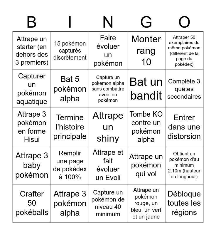 This bingo card has a free space and 24 words: Remplir une page de pokédex à 100%, Attrape 3 pokémon alpha, Capture un pokemon alpha sans combattre avec ton pokémon, Crafter 50 pokéballs, Attraper 50 exemplaires du même pokémon (différent de la page du pokédex), Attrape un starter (en dehors des 3 premiers), Capturer un pokémon aquatique, 15 pokémon capturés discrètement, Tombe KO contre un pokémon alpha, Attrape et fait évoluer un Evoli, Bat un bandit, Attrape 3 pokémon en forme Hisui, Attrape un pokémon qui vol, Obtient un pokémon d'au minimum 2.10m (hauteur ou longueur), Bat 5 pokémon alpha, Attrape un pokémon rouge, un bleu, un vert et un jaune, Entrer dans une distorsion, Faire évoluer un pokémon, Complète 3 quêtes secondaires, Termine l'histoire principale, Débloque toutes les régions, Attrape 3 baby pokémon, Monter rang 10 and Capture un pokémon de niveau 40 minimum.
