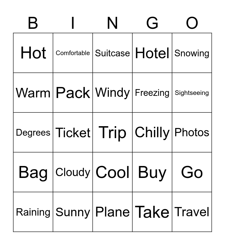 This bingo card has a free space and 24 words: Cloudy, Sunny, Windy, Raining, Snowing, Hot, Warm, Comfortable, Chilly, Cool, Freezing, Degrees, Buy, Go, Pack, Take, Photos, Suitcase, Sightseeing, Ticket, Travel, Bag, Hotel and Plane.