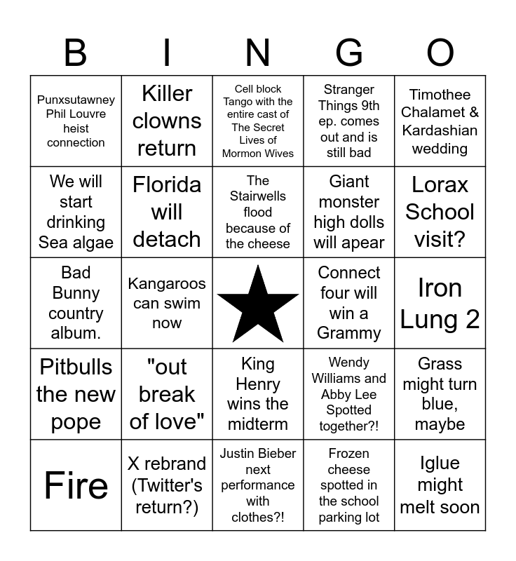This bingo card has a free space and 24 words: "out break of love", X rebrand (Twitter's return?), The Stairwells flood because of the cheese, Fire, Timothee Chalamet & Kardashian wedding, Punxsutawney Phil Louvre heist connection, We will start drinking Sea algae, Killer clowns return, Connect four will win a Grammy, King Henry wins the midterm, Giant monster high dolls will apear, Bad Bunny country album., Wendy Williams and Abby Lee Spotted together?!, Grass might turn blue, maybe, Florida will detach, Frozen cheese spotted in the school parking lot, Iron Lung 2, Cell block Tango with the entire cast of The Secret Lives of Mormon Wives, Lorax School visit?, Kangaroos can swim now, Iglue might melt soon, Pitbulls the new pope, Stranger Things 9th ep. comes out and is still bad and Justin Bieber next performance with clothes?!.