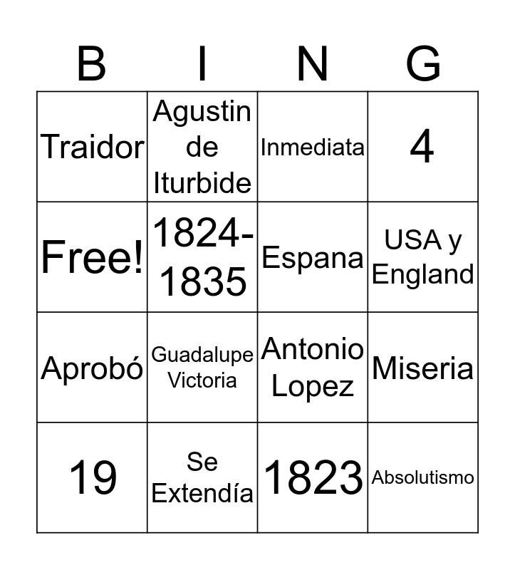 This bingo card has 16 words: Se Extendía, Miseria, Inmediata, Traidor, Aprobó, Agustin de Iturbide, Antonio Lopez, 1823, Free!, 1824-1835, 19, 4, Guadalupe Victoria, USA y England, Espana and Absolutismo.