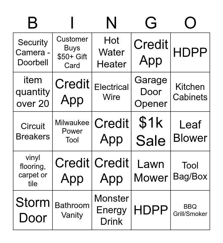 This bingo card has a free space and 24 words: Credit App, Bathroom Vanity, Electrical Wire, Storm Door, HDPP, Security Camera - Doorbell, item quantity over 20, Customer Buys $50+ Gift Card, $1k Sale, Credit App, Garage Door Opener, Circuit Breakers, Lawn Mower, Tool Bag/Box, Credit App, HDPP, Leaf Blower, Hot Water Heater, Kitchen Cabinets, Milwaukee Power Tool, BBQ Grill/Smoker, vinyl flooring, carpet or tile, Credit App and Monster Energy Drink.