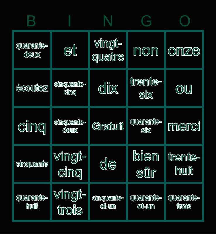 This bingo card has a free space and 29 words: vingt-deux, vingt-trois, vingt-quatre, quarante-quatre, onze, quarante-deux, cinquante-cinq, dix, quarante-six, trente-huit, quarante-huit, cinquante-deux, quarante-et-un, quarante-trois, cinq, quarante-sept, cinquante-et-un, bien sûr, ou, cinquante, vingt-cinq, vingt-sept, trente-six, merci, écoutez, et, de, non and aussi.