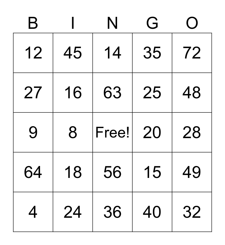 This bingo card has a free space and 29 words: 4, 6, 8, 10, 12, 14, 16, 18, 20, 24, 28, 32, 36, 40, 48, 54, 56, 64, 72, 9, 15, 21, 25, 27, 35, 45, 49, 63 and 81.