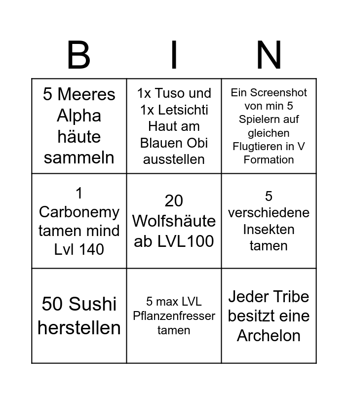 This bingo card has a free space and 8 words: 5 verschiedene Insekten tamen, Ein Screenshot von min 5 Spielern auf gleichen Flugtieren in V Formation, 1x Tuso und 1x Letsichti Haut am Blauen Obi ausstellen, 50 Sushi herstellen, 5 Meeres Alpha häute sammeln, Jeder Tribe besitzt eine Archelon, 1 Carbonemy tamen mind Lvl 140 and 5 max LVL Pflanzenfresser tamen.