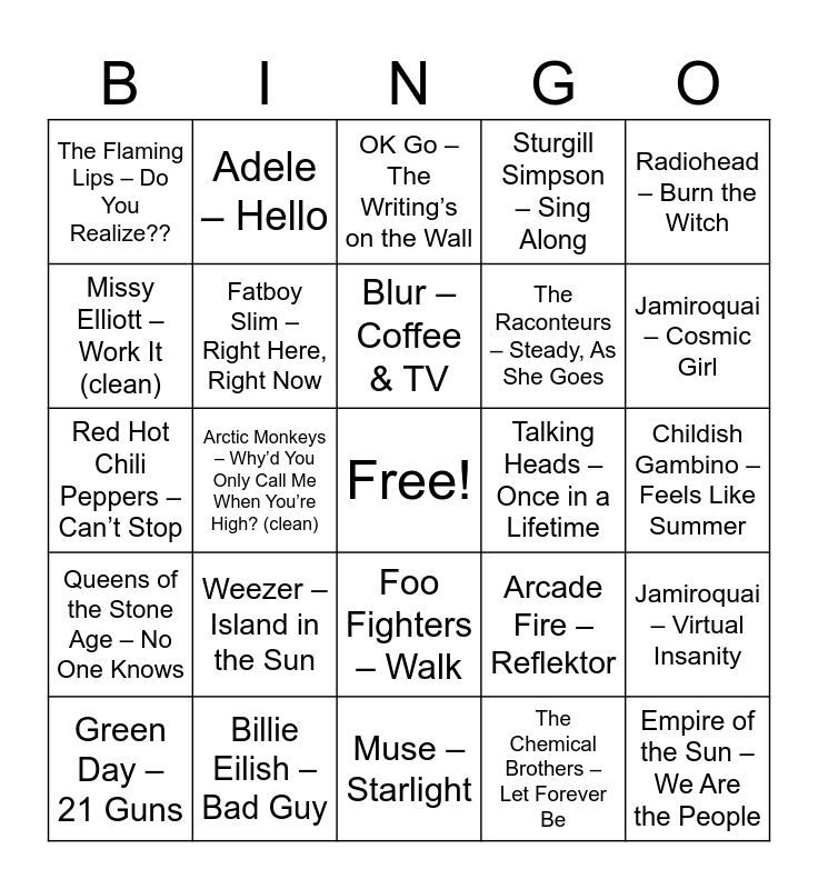 This bingo card has a free space and 76 words: Guns N’ Roses -November Rain, Peter Gabriel - Sledgehammer, OK Go – The Writing’s on the Wall, David Bowie – Ashes to Ashes, Gorillaz – On Melancholy Hill, Muse – Time Is Running Out, Coldplay – Adventure of a Lifetime, Talking Heads – Road to Nowhere, Weezer – Pork and Beans, OutKast – Ms. Jackson, Peter Gabriel – Big Time, Foo Fighters – Big Me, Blur – Coffee & TV, Missy Elliott – Work It (clean), Daft Punk – Digital Love, Arctic Monkeys – Why’d You Only Call Me When You’re High? (clean), The White Stripes – The Hardest Button to Button, Empire of the Sun – We Are the People, Beck – E-Pro, Radiohead – Burn the Witch, Florence + The Machine – Dog Days Are Over, Red Hot Chili Peppers – Can’t Stop, Fatboy Slim – Right Here, Right Now, Adele – Hello, Sturgill Simpson – Sing Along, Foster the People – Houdini, Kanye West – Stronger (clean), The Killers – When You Were Young, Björk – Army of Me, MGMT – Time to Pretend, The Black Keys – Howlin’ for You, Twenty One Pilots – Stressed Out, Phoenix – 1901, Arcade Fire – Reflektor, Jamiroquai – Cosmic Girl, The Raconteurs – Steady, As She Goes, Billie Eilish – When the Party’s Over, Queens of the Stone Age – Go With the Flow, Childish Gambino – Feels Like Summer, The Chemical Brothers – Let Forever Be, Modest Mouse – Dashboard, Hozier – Movement, The Strokes – Reptilia, Sia – Elastic Heart, Wilco – The Late Greats, Cold War Kids – First, Green Day – 21 Guns, The Flaming Lips – Do You Realize??, The Weeknd – Take My Breath, Tame Impala – Feels Like We Only Go Backwards, Florence + The Machine – Shake It Out, Foo Fighters – Walk, OutKast – Roses, OK Go – Upside Down & Inside Out, Muse – Uprising, Daft Punk – One More Time, Radiohead – Daydreaming, The Killers – Human, Beck – Loser, Foster the People – Helena Beat, Weezer – Island in the Sun, Coldplay – Up&Up, The Black Keys – Lonely Boy, Arctic Monkeys – Do I Wanna Know?, Adele – Rolling in the Deep, Empire of the Sun – Walking on a Dream, Talking Heads – Once in a Lifetime, Missy Elliott – Get Ur Freak On (clean), Peter Gabriel – Shock the Monkey, Gorillaz – Feel Good Inc., Jamiroquai – Virtual Insanity, Queens of the Stone Age – No One Knows, Billie Eilish – Bad Guy, Childish Gambino – This Is America, Muse – Starlight and OK Go – Here It Goes Again.