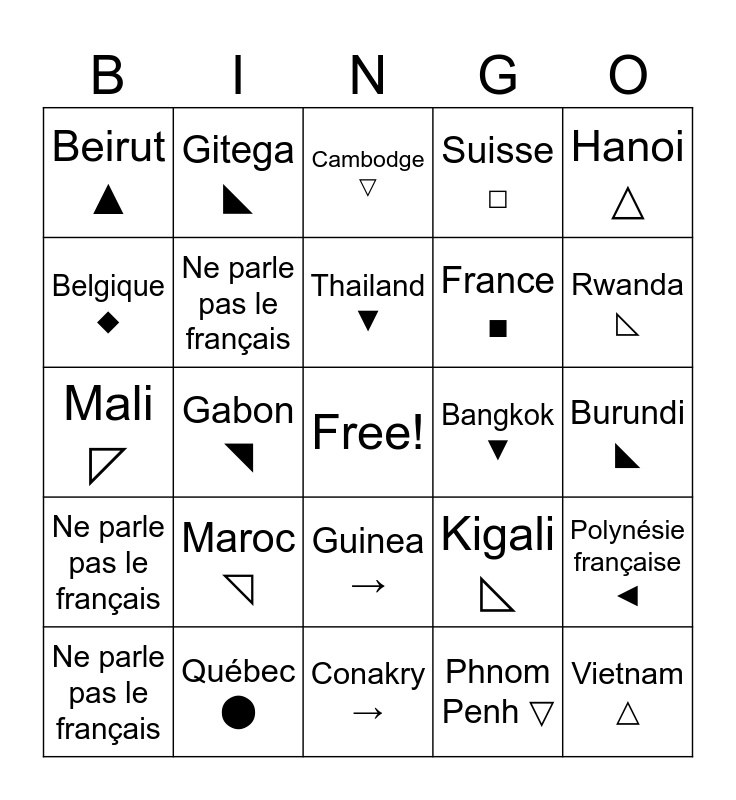 This bingo card has a free space and 62 words: Canada ⬤, Québec ⬤, Haiti ◖, Ne parle pas le français, Port-au-Prince ◖, Guyane ◗, Ne parle pas le français, Cayenne ◗, France ■, Paris ■, Suisse □, Berine □, Belgique ◆, Bruxelles ◆, Liban ▲, Beirut ▲, Vietnam △, Hanoi △, Ne parle pas le français, Thailand ▼, Bangkok ▼, Cambodge ▽, Ne parle pas le français, Phnom Penh ▽, Vanuatu ▶, Port Vila▶, Nouvelle- Caledonie ▷, Nouméa ▷, Polynésie française ◀, Papeete ◀, Bénin ◁, Porto-Novo ◁, Burkina-Faso ◢, Ougadou-gou ◢, Burundi ◣, Gitega ◣, Comores ◤, Moroni ◤, Gabon ◥, Libreville ◥, Mali ◸, Bamako ◸, Maroc ◹, Rabat ◹, Rwanda ◺, Kigali ◺, Tchad ←, N'Djamena ←, Togo ↑, Lome ↑, Guinea →, Conakry →, Senegal ↓, Dakar ↓, Cap-Vert ↖, Centrafr-ique ↗, Praia ↖, Bangui ↗, Mada-gascar ↘, Antana-narivo ↘, Seychelles ↙ and Victoria ↙.