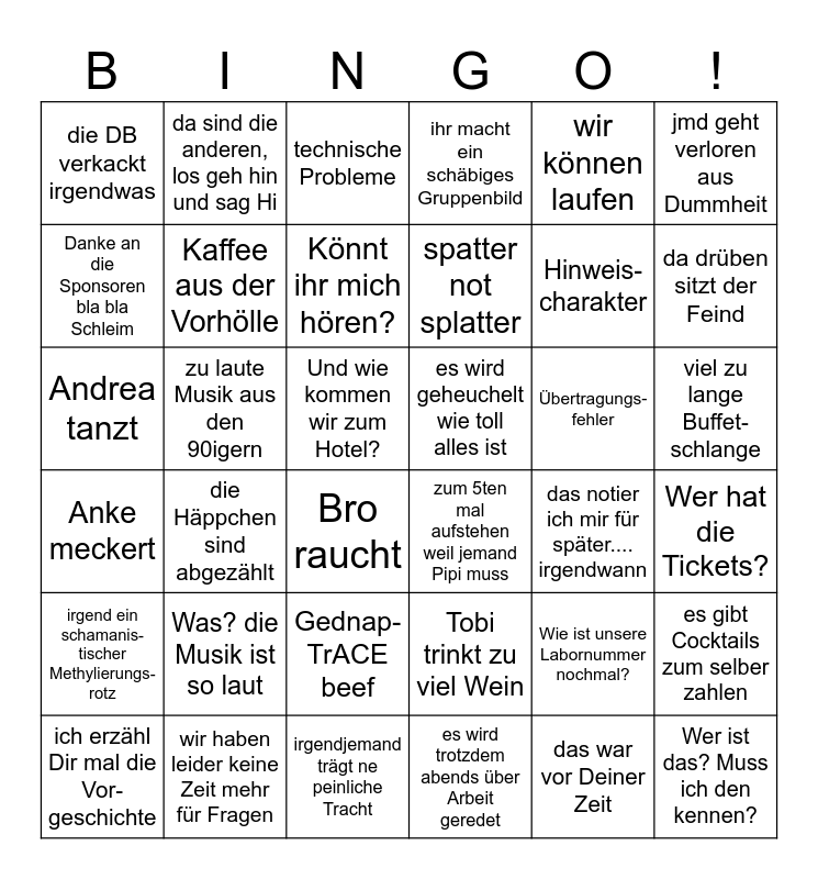This bingo card has 36 words: Anke meckert, die Häppchen sind abgezählt, irgendjemand trägt ne peinliche Tracht, spatter not splatter, Übertragungs- fehler, viel zu lange Buffet- schlange, die DB verkackt irgendwas, wir haben leider keine Zeit mehr für Fragen, technische Probleme, Tobi trinkt zu viel Wein, Hinweis- charakter, jmd geht verloren aus Dummheit, irgend ein schamanis- tischer Methylierungs- rotz, zu laute Musik aus den 90igern, Könnt ihr mich hören?, ihr macht ein schäbiges Gruppenbild, Wie ist unsere Labornummer nochmal?, Wer hat die Tickets?, Danke an die Sponsoren bla bla Schleim, Kaffee aus der Vorhölle, Bro raucht, zum 5ten mal aufstehen weil jemand Pipi muss, das notier ich mir für später.... irgendwann, es gibt Cocktails zum selber zahlen, Andrea tanzt, da sind die anderen, los geh hin und sag Hi, Und wie kommen wir zum Hotel?, es wird trotzdem abends über Arbeit geredet, wir können laufen, da drüben sitzt der Feind, ich erzähl Dir mal die Vor- geschichte, Was? die Musik ist so laut, Gednap-TrACE beef, es wird geheuchelt wie toll alles ist, das war vor Deiner Zeit and Wer ist das? Muss ich den kennen?.