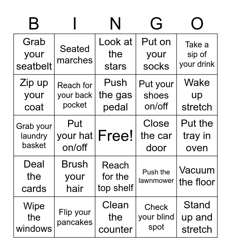This bingo card has a free space and 24 words: Brush your hair, Flip your pancakes, Push the gas pedal, Wipe the windows, Take a sip of your drink, Grab your seatbelt, Zip up your coat, Seated marches, Close the car door, Reach for the top shelf, Put your shoes on/off, Grab your laundry basket, Push the lawnmower, Vacuum the floor, Reach for your back pocket, Check your blind spot, Put the tray in oven, Look at the stars, Wake up stretch, Put your hat on/off, Stand up and stretch, Deal the cards, Put on your socks and Clean the counter.