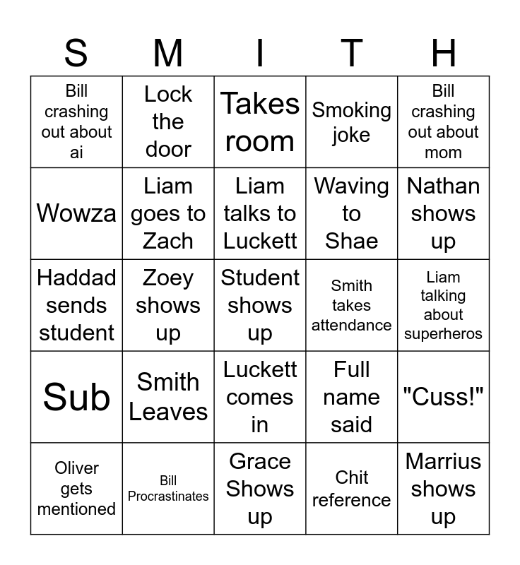 This bingo card has a free space and 24 words: Smith Leaves, Bill Procrastinates, Liam talks to Luckett, Oliver gets mentioned, Bill crashing out about mom, Bill crashing out about ai, Wowza, Lock the door, Smith takes attendance, Luckett comes in, Waving to Shae, Haddad sends student, Full name said, "Cuss!", Liam goes to Zach, Chit reference, Liam talking about superheros, Takes room, Nathan shows up, Zoey shows up, Marrius shows up, Sub, Smoking joke and Grace Shows up.