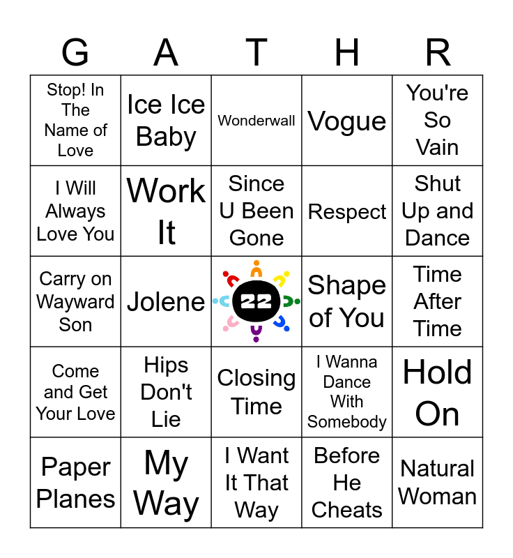 This bingo card has a free space and 51 words: Single Ladies, Natural Woman, Crazy in Love, I Want It That Way, Hips Don't Lie, Wannabe, Ice Ice Baby, U Can't Touch This, I Will Always Love You, ...Baby One More Time, Work It, Vogue, Hold On, I Wanna Dance With Somebody, Defying Gravity, Adore You, Since U Been Gone, Shape of You, Billie Jean, You're So Vain, Jolene, Before He Cheats, Stop! In The Name of Love, Respect, Born to Run, Mr. Brightside, Shut Up and Dance, Pour Some Sugar On Me, Paper Planes, Wonderwall, Mystical Magical, I Love Rock n Roll, Love Shack, Y.M.C.A, Baby Got Back, My Way, Bohemian Rhapsody, Shallow, Never Gonna Give You Up, Holding Out for a Hero, Time After Time, Come and Get Your Love, I'll Make Love to You, Careless Whisper, Total Eclipse of the Heart, Kiss from a Rose, Carry on Wayward Son, Somebody To Love, Love Is All Around, Closing Time and Tití Me Preguntó.