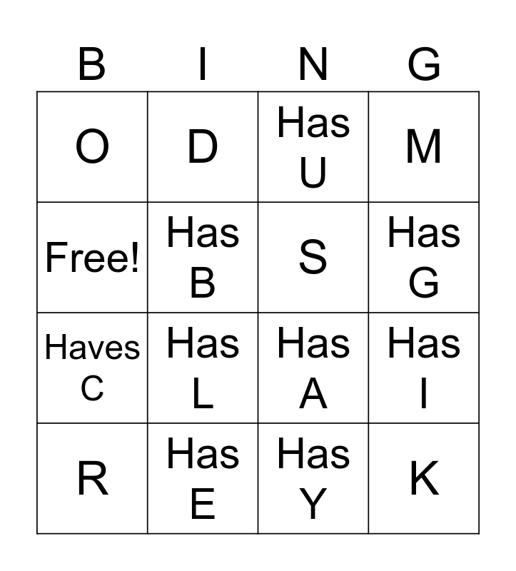 This bingo card has 16 words: Has E, Has I, Has U, O, Haves C, D, Has A, Has Y, Free!, Has B, R, M, Has L, Has G, S and K.