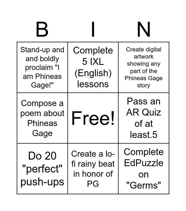 This bingo card has a free space and 8 words: Pass an AR Quiz of at least.5, Create digital artwork showing any part of the Phineas Gage story, Complete 5 IXL (English) lessons, Do 20 "perfect" push-ups, Stand-up and and boldly proclaim "I am Phineas Gage!", Complete EdPuzzle on "Germs", Compose a poem about Phineas Gage and Create a lo-fi rainy beat in honor of PG.