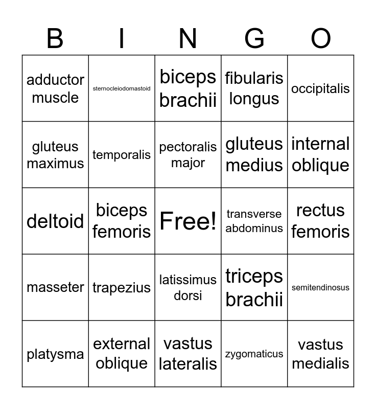 This bingo card has a free space and 34 words: frontalis, zygomaticus, buccinators, orbicularis oris, masseter, temporalis, occipitalis, platysma, sternocleiodomastoid, deltoid, pectoralis major, biceps brachii, brachioradialis, rectus abdominis, transverse abdominus, internal oblique, external oblique, deltoid, trapezius, triceps brachii, latissimus dorsi, sartorius, adductor muscle, rectus femoris, vastus lateralis, vastus medialis, fibularis longus, tibialis anterior, gluteus medius, gluteus maximus, adductor muscles, biceps femoris, semitendinosus and soleus.