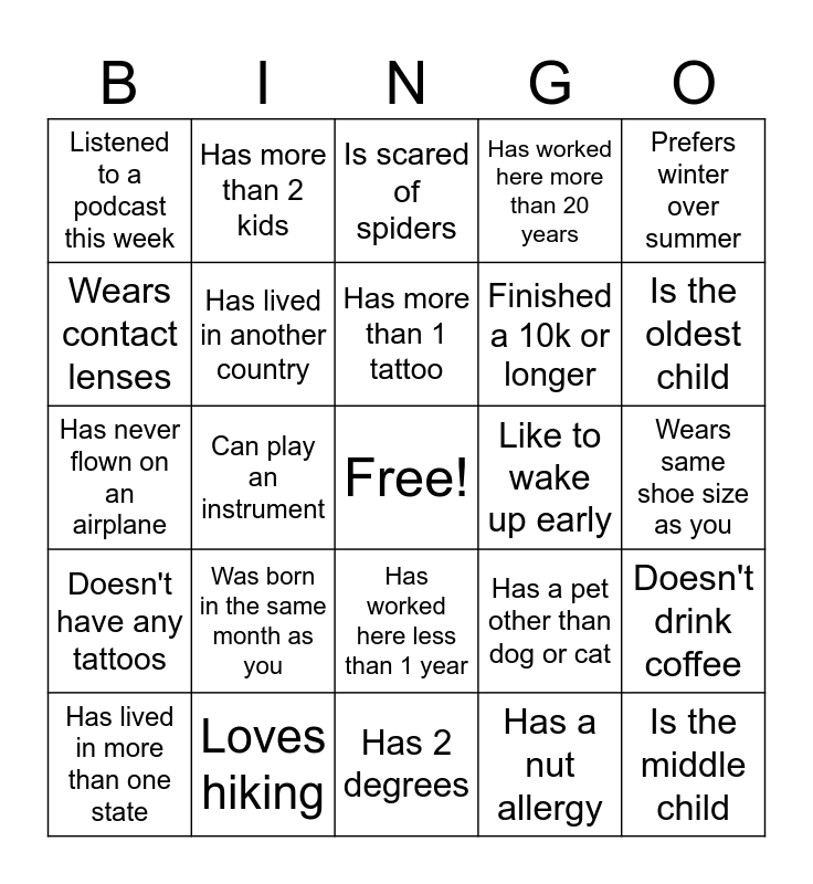 This bingo card has a free space and 50 words: Speaks 2 other languages, Is the middle child, Has more than 2 siblings, Has 2 degrees, Was born in the same month as you, Is not on social media, Has more than 2 kids, Has broken a bone, Wears contact lenses, Is left-handed, Has lived in another country, Has worked here more than 20 years, Doesn't drink coffee, Has a pet other than dog or cat, Loves to bake, Loves to go camping, Has more than 1 tattoo, Like to wake up early, Has a birthday this month, Prefers winter over summer, Can play an instrument, Has a nut allergy, Listened to a podcast this week, Finished a 10k or longer, Has a garden, Has been to a concert in the last month, Is the oldest child, Read 5 or more books in the last year, Is scared of spiders, Has worked here less than 1 year, Is an only child, Has never gotten a speeding ticket, Is a morning person, Is a night owl, Loves hiking, Loves video games, Been on a cruise, Has been scuba diving, Has been sky diving, Wears same shoe size as you, Has volunteered recently, Has met a celebrity, Can solve a Rubik's cube, Has traveled to more than 3 countries, Has lived in more than one state, Has never flown on an airplane, Has a unique collection, Loves to bake, Doesn't have any tattoos and Has worked in fast food.