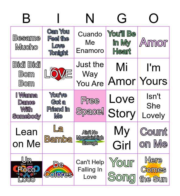 This bingo card has 5 images, a free space and 25 words: Un Poco Loco, La Bamba, Just the Way You Are, Your Song, I'm Yours, Besame Mucho, Can You Feel the Love Tonight, Cuando Me Enamoro, Mi Amor, Count on Me, I Wanna Dance With Somebody, LOVE, My Girl, Here Comes the Sun, Bidi Bidi Bom Bom, De Colores, Can't Help Falling In Love, You'll Be in My Heart, Isn't She Lovely, Lean on Me, You've Got a Friend in Me, Ain't No MountainHigh Enough, Love Story, Amor and ABC.