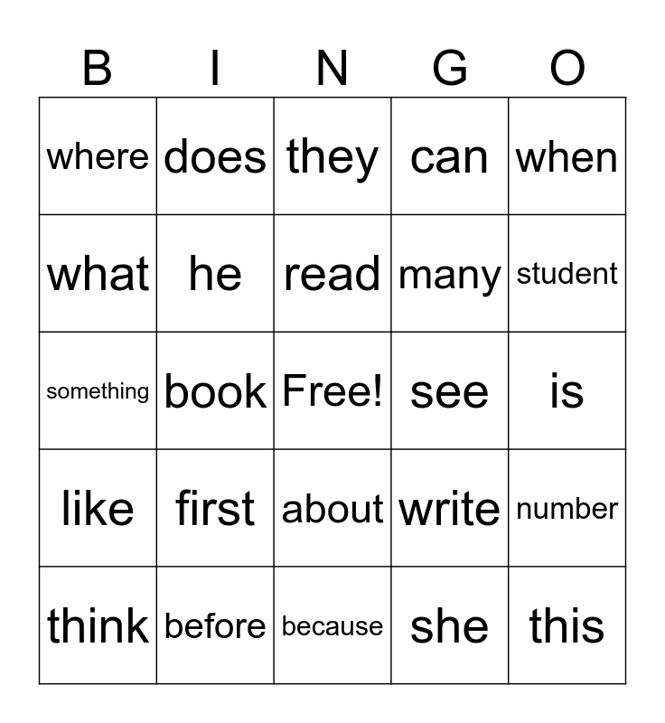 This bingo card has a free space and 24 words: first, before, read, think, when, where, what, does, see, about, many, something, write, number, he, she, is, they, student, book, this, like, can and because.
