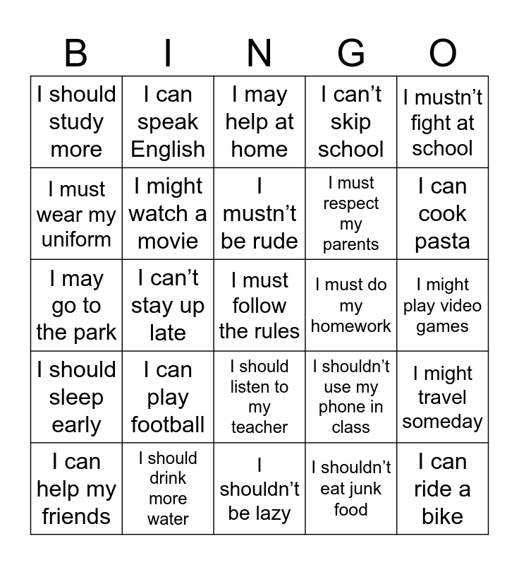 This bingo card has a free space and 24 words: I can play football, I should drink more water, I mustn’t be rude, I can help my friends, I mustn’t fight at school, I should study more, I must wear my uniform, I can speak English, I must do my homework, I should listen to my teacher, I must respect my parents, I may go to the park, I shouldn’t use my phone in class, I might travel someday, I might watch a movie, I shouldn’t eat junk food, I might play video games, I may help at home, I can cook pasta, I can’t stay up late, I can ride a bike, I should sleep early, I can’t skip school and I shouldn’t be lazy.