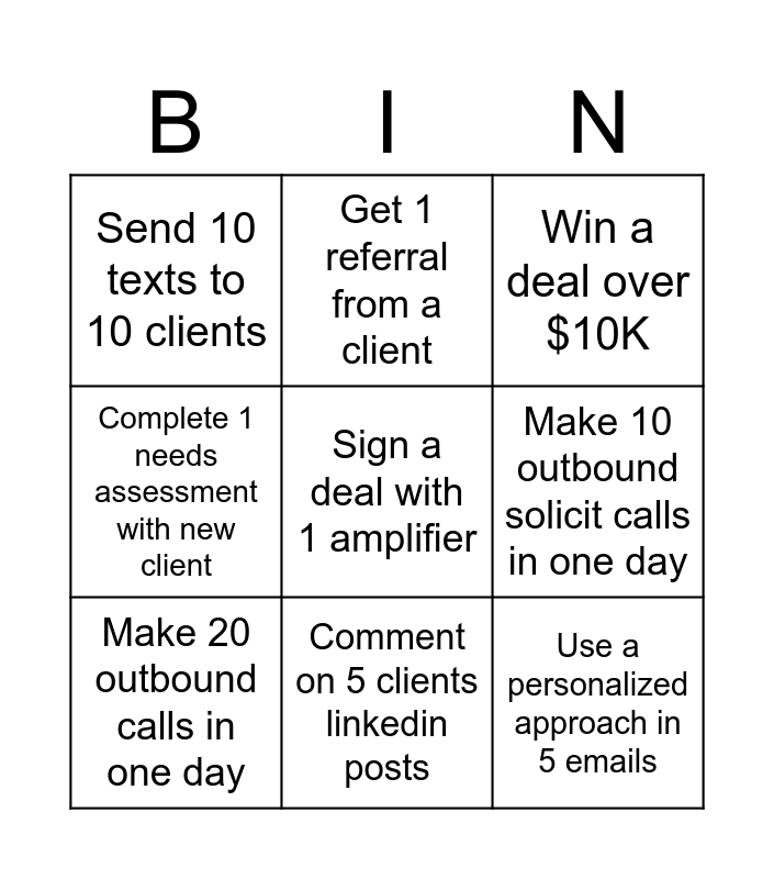 This bingo card has 9 words: Make 20 outbound calls in one day, Win a deal over $10K, Get 1 referral from a client, Complete 1 needs assessment with new client, Send 10 texts to 10 clients, Make 10 outbound solicit calls in one day, Sign a deal with 1 amplifier, Use a personalized approach in 5 emails and Comment on 5 clients linkedin posts.
