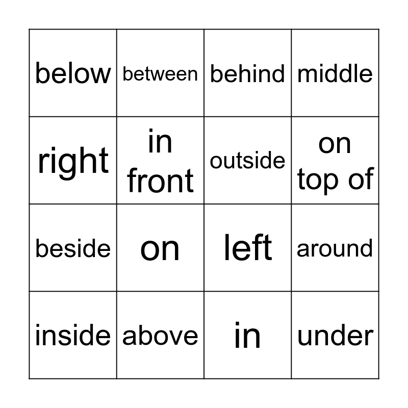 This bingo card has 16 words: above, around, behind, below, beside, between, left, in, right, in front, inside, middle, on, on top of, outside and under.