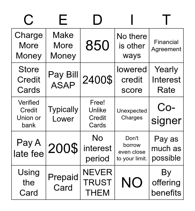 This bingo card has a free space and 24 words: 200$, Prepaid Card, 2400$, Using the Card, Financial Agreement, Charge More Money, Store Credit Cards, Make More Money, Unexpected Charges, No interest period, lowered credit score, Verified Credit Union or bank, Don't borrow even close to your limit., Pay as much as possible, Pay Bill ASAP, NO, Co-signer, 850, Yearly Interest Rate, Typically Lower, By offering benefits, Pay A late fee, No there is other ways and NEVER TRUST THEM.