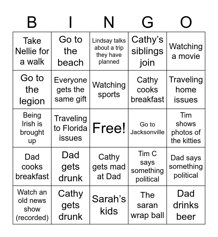 This bingo card has a free space and 24 words: Dad gets drunk, Cathy gets drunk, Watching sports, Watch an old news show (recorded), Watching a movie, Take Nellie for a walk, Go to the legion, Go to the beach, Go to Jacksonville, Cathy gets mad at Dad, Cathy cooks breakfast, Being Irish is brought up, Tim C says something political, Dad says something political, Everyone gets the same gift, The saran wrap ball, Tim shows photos of the kitties, Lindsay talks about a trip they have planned, Traveling home issues, Traveling to Florida issues, Dad drinks beer, Dad cooks breakfast, Cathy’s siblings join and Sarah’s kids.