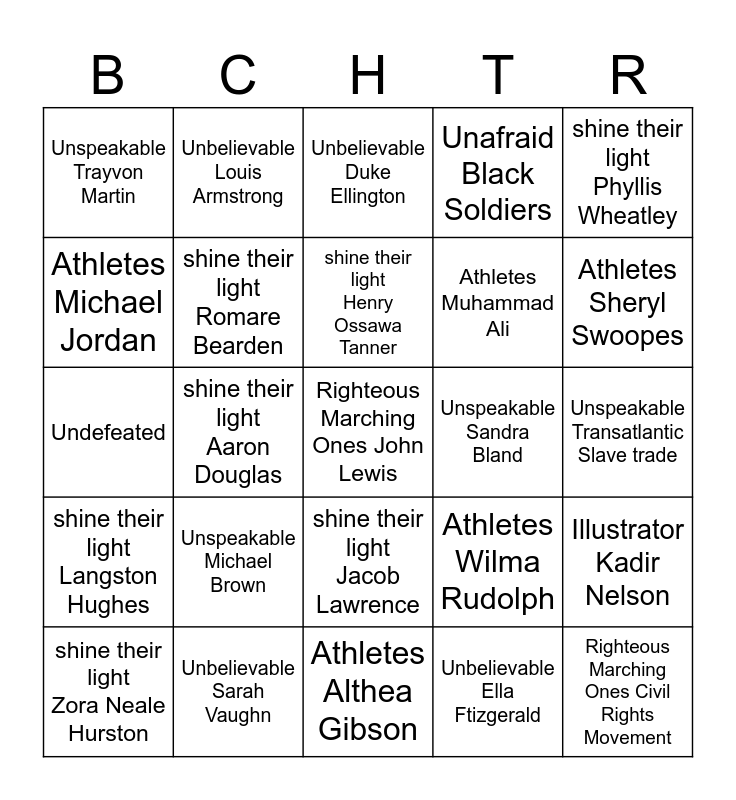 This bingo card has a free space and 39 words: Unforgettable Jesse Owens, Undeniable Slavery, Unflappable Jack Johnson, shine their light Romare Bearden, shine their light Zora Neale Hurston, shine their light Jacob Lawrence, shine their light Henry Ossawa Tanner, shine their light Augusta Savage, shine their light Phyllis Wheatley, shine their light Langston Hughes, shine their light Aaron Douglas, Unafraid Black Soldiers, Righteous Marching Ones Civil Rights Movement, Unspeakable Transatlantic Slave trade, Unspeakable Sandra Bland, Unspeakable Michael Brown, Unspeakable Tamir Rice, Unspeakable Trayvon Martin, Unlimited Martin Luther King, Jr., Athletes Wilma Rudolph, Athletes Michael Jordan, Athletes Althea Gibson, Athletes Muhammad Ali, Athletes Sheryl Swoopes, Athletes Jesse Owens, Athletes Serena Williams, Athletes Reece Whitley, Athletes LeBron James, Unbelievable Thelonious Monk, Unbelievable Louis Armstrong, Unbelievable Billie Holiday, Unbelievable Miles Davis, Unbelievable Duke Ellington, Unbelievable Sarah Vaughn, Unbelievable Ella Ftizgerald, Author Kwame Alexander, Illustrator Kadir Nelson, Undefeated and You.