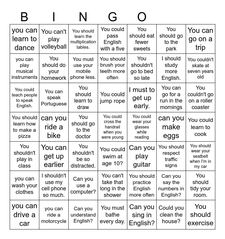 This bingo card has 49 words: Can you say the numbers in English?, I should study more English., Can you sing in English?, can you ride a bike, You should learn to draw, You could learn to cook, You can't play volleyball, Can you understand English?, You should go to the park, You could swim at age 10?, You can go on a trip, You could pass English with a five, You can go for a run in the mornings, I must to get up early., I shouldn't use my cell phone so much., can you make eggs, you can play musical instruments, You couldn't skate at seven years old, You should tidy your room., You should eat fewer sweets, You shouldn't go to bed so late, You should go to the doctor, you can learn to dance, You should do your homework, you can drive a car, You must use your mobile phone less., You couldn't go on a roller coaster, you can ride a motorcycle, You could jump rope, You can speak Portuguese, You should exercise, You could wear your glasses while reading, you can wash your clothes, Can you use a computer?, You should learn how to make a pizza, Can you play guitar, You should respect traffic signs, You should wear your seatbelt when I'm in my car, You could teach people to speak English., You shouldn't be so distracted., You can't take that long in the shower, You shouldn't play in class, You could cross the handrail when you were young, You must bathe every day., You should brush your teeth more often, You should learn the multiplication tables., You should practice English more often, You can get up earlier and Could you clean the house?.