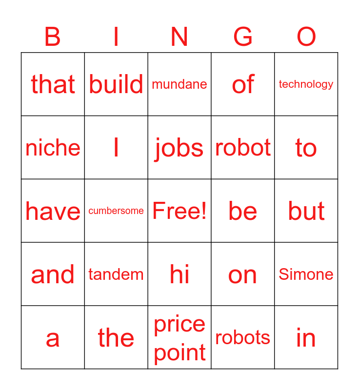 This bingo card has a free space and 24 words: tandem, the, jobs, a, technology, that, niche, build, be, hi, robot, have, on, Simone, I, robots, but, mundane, to, cumbersome, in, and, of and price point.