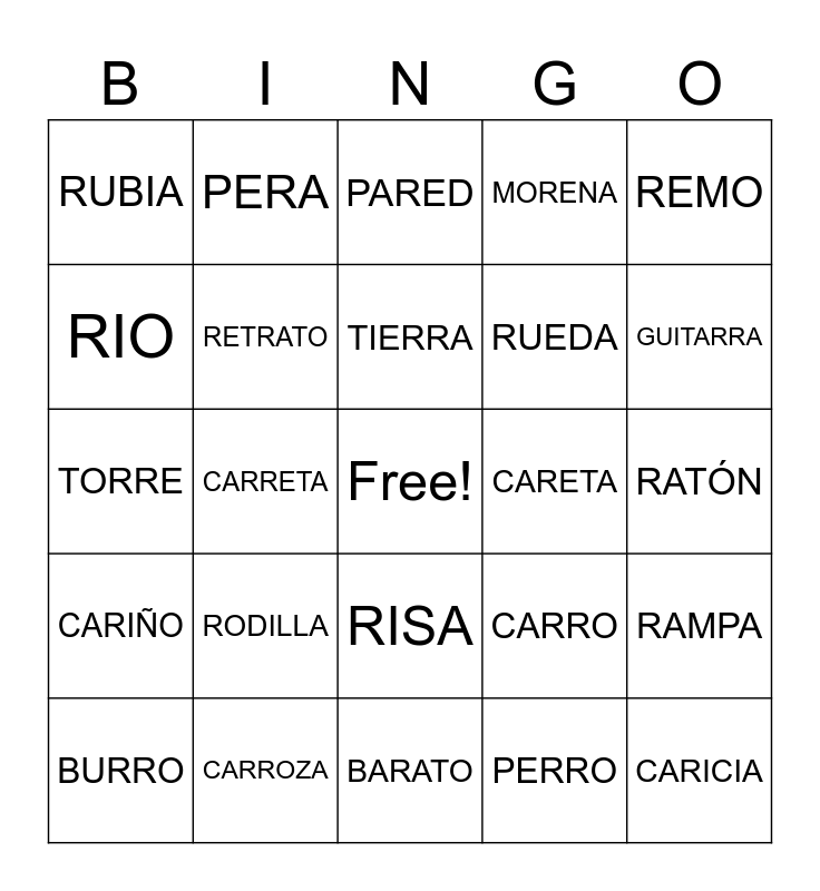 This bingo card has a free space and 24 words: RODILLA, CARROZA, TIERRA, BURRO, REMO, RUBIA, RIO, PERA, CARETA, RISA, RUEDA, TORRE, CARRO, RAMPA, RETRATO, PERRO, RATÓN, PARED, GUITARRA, CARRETA, CARICIA, CARIÑO, MORENA and BARATO.