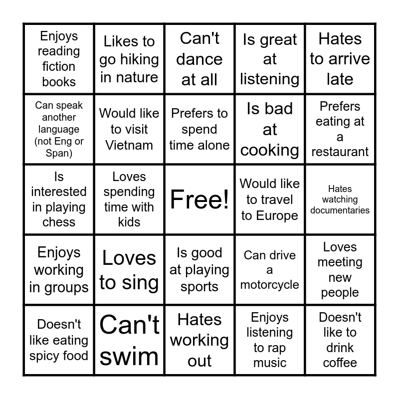 This bingo card has a free space and 24 words: Loves to sing, Can't swim, Prefers to spend time alone, Doesn't like eating spicy food, Hates to arrive late, Enjoys reading fiction books, Can speak another language (not Eng or Span), Likes to go hiking in nature, Would like to travel to Europe, Is good at playing sports, Is bad at cooking, Is interested in playing chess, Can drive a motorcycle, Loves meeting new people, Would like to visit Vietnam, Enjoys listening to rap music, Hates watching documentaries, Can't dance at all, Prefers eating at a restaurant, Loves spending time with kids, Doesn't like to drink coffee, Enjoys working in groups, Is great at listening and Hates working out.