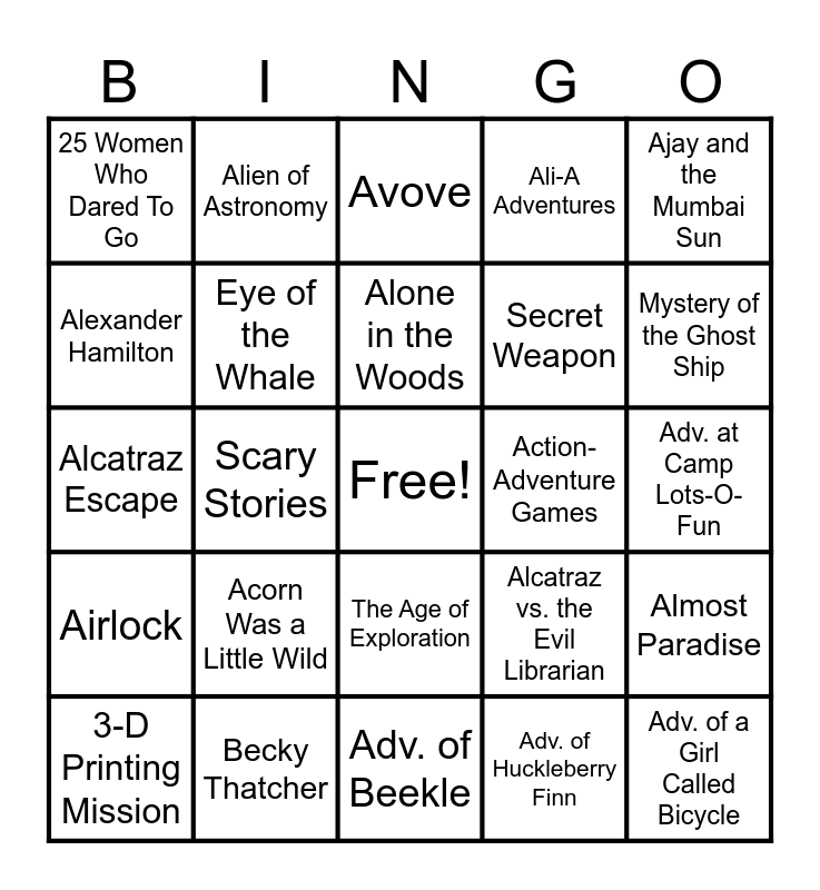 This bingo card has a free space and 29 words: 3-D Printing Mission, Spider-Man, Scary Stories, Sand Warrior, 25 Women Who Dared To Go, Avove, Eye of the Whale, Acorn Was a Little Wild, Action-Adventure Games, Becky Thatcher, Adv. at Camp Lots-O-Fun, Adv. of a Girl Called Bicycle, Adv. of Beekle, Adv. of Huckleberry Finn, Mystery of the Ghost Ship, Adv. of Tom Sawyer, The Age of Exploration, Airlock, Ajay and the Mumbai Sun, Alcatraz Escape, Alcatraz vs. the Evil Librarian, Scorpia, Secret Weapon, Alexander Hamilton, Ali-A Adventures, Alien of Astronomy, Almost Paradise, Alone in the Woods and Amazon Adventure.
