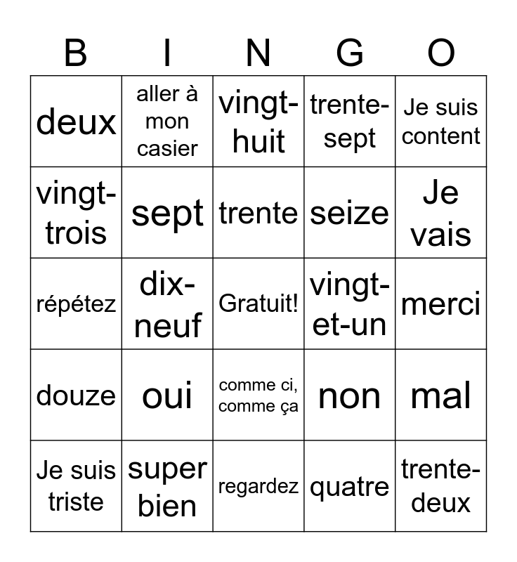 This bingo card has a free space and 24 words: oui, super bien, trente, Je suis triste, Je suis content, deux, vingt-trois, aller à mon casier, vingt-et-un, comme ci, comme ça, seize, répétez, non, mal, sept, quatre, merci, vingt-huit, Je vais, dix-neuf, trente-deux, douze, trente-sept and regardez.