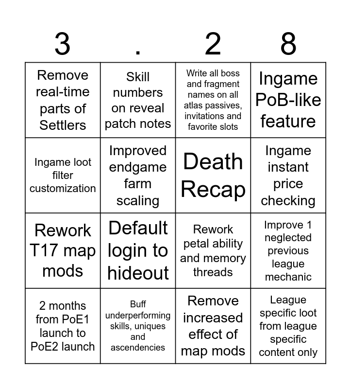 This bingo card has 16 words: Buff underperforming skills, uniques and ascendencies, Improve 1 neglected previous league mechanic, Write all boss and fragment names on all atlas passives, invitations and favorite slots, Remove real-time parts of Settlers, Rework T17 map mods, Skill numbers on reveal patch notes, Rework petal ability and memory threads, Remove increased effect of map mods, Ingame loot filter customization, Improved endgame farm scaling, 2 months from PoE1 launch to PoE2 launch, Ingame PoB-like feature, Default login to hideout, Ingame instant price checking, Death Recap and League specific loot from league specific content only.